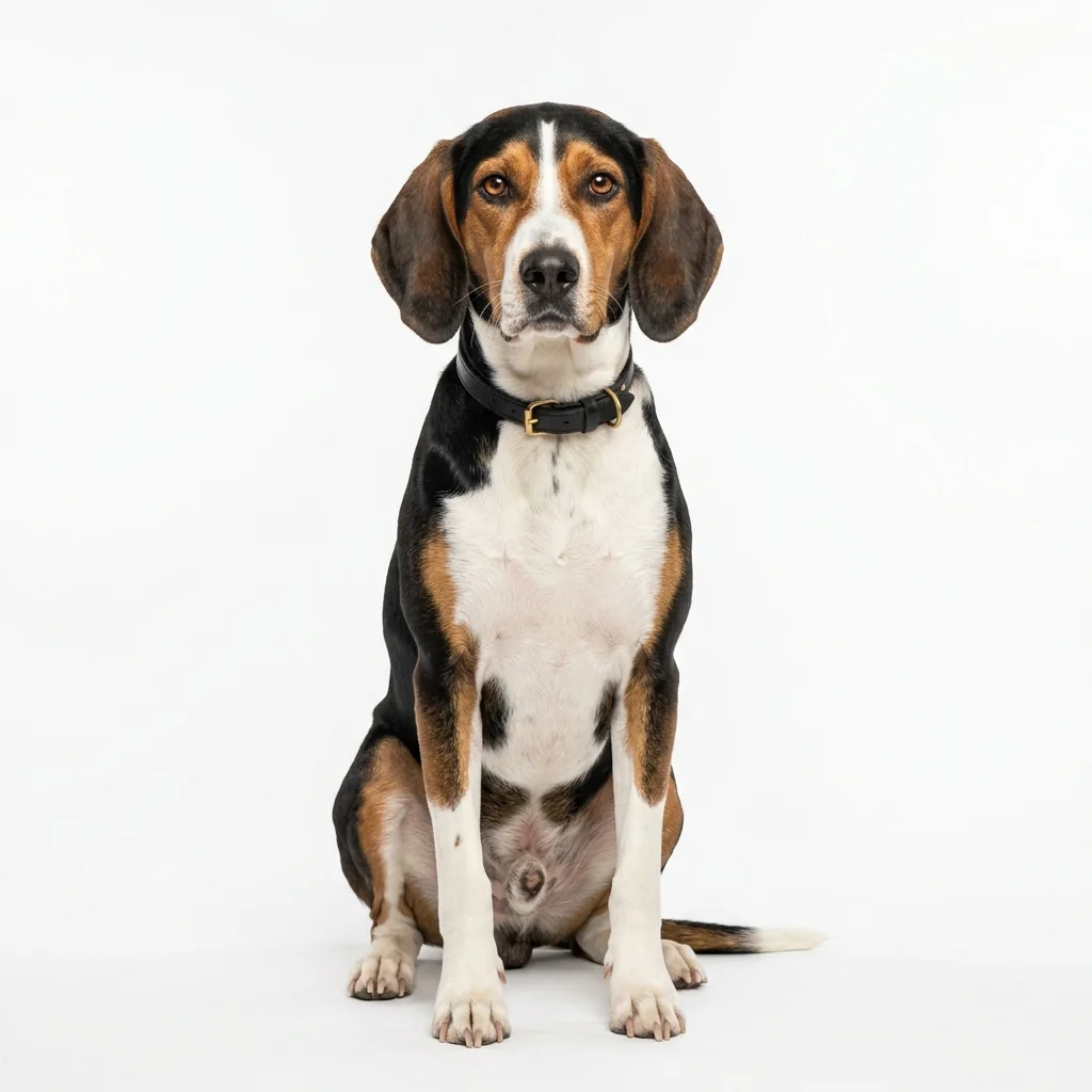 Großer französischer Meutehund in dreifarbiger Zeichnung. Er ist ausdauernd, nasenstark und vorrangig ein Arbeitshund auf Hochwild.