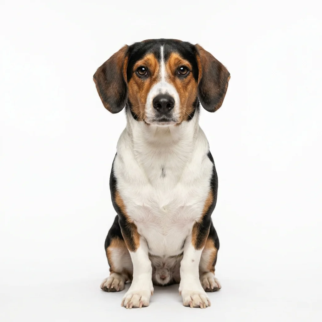 Kurzläufiger schwedischer Laufhund mit kurzem Haarkleid und dreifarbiger Zeichnung. Spezialisiert auf die langsame Spurjagd auf Rehe und Hasen im Schnee.