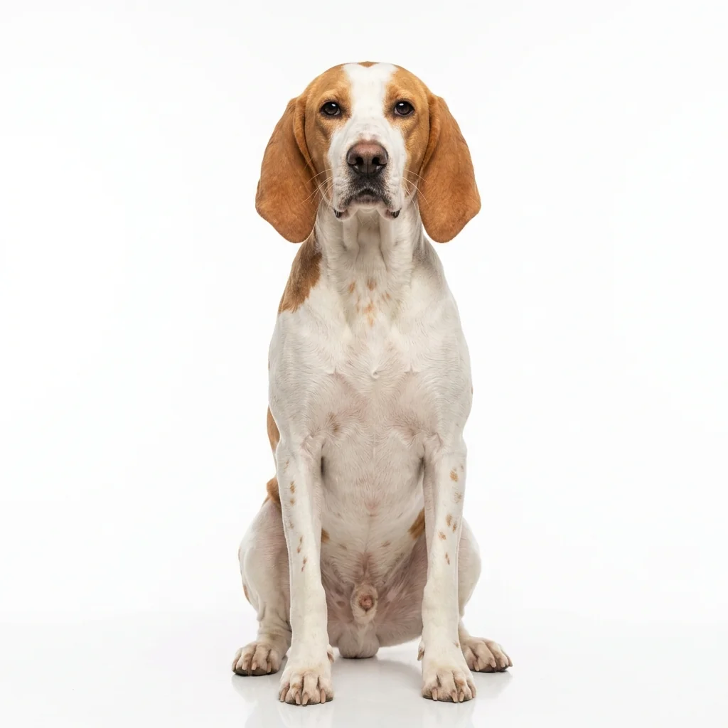 Großer weiß-oranger französischer Meutehund. Er ist ein Spezialist für die Parforcejagd und im häuslichen Umfeld eher selten anzutreffen.
