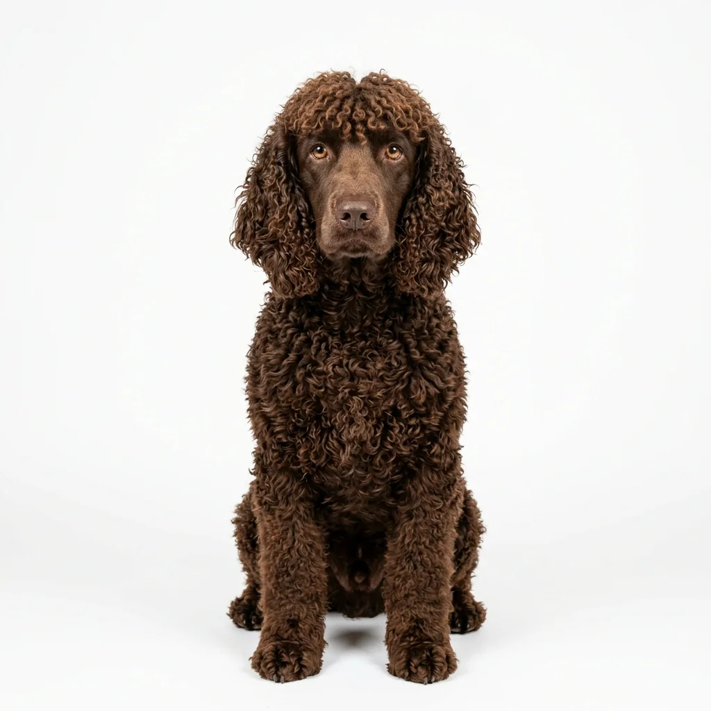 Großer irischer Wasserapportierhund mit dicht gelocktem, leberbraunem Haarkleid und rattenartiger, haarloser Rute. Spezialisiert auf Wasserarbeit.
