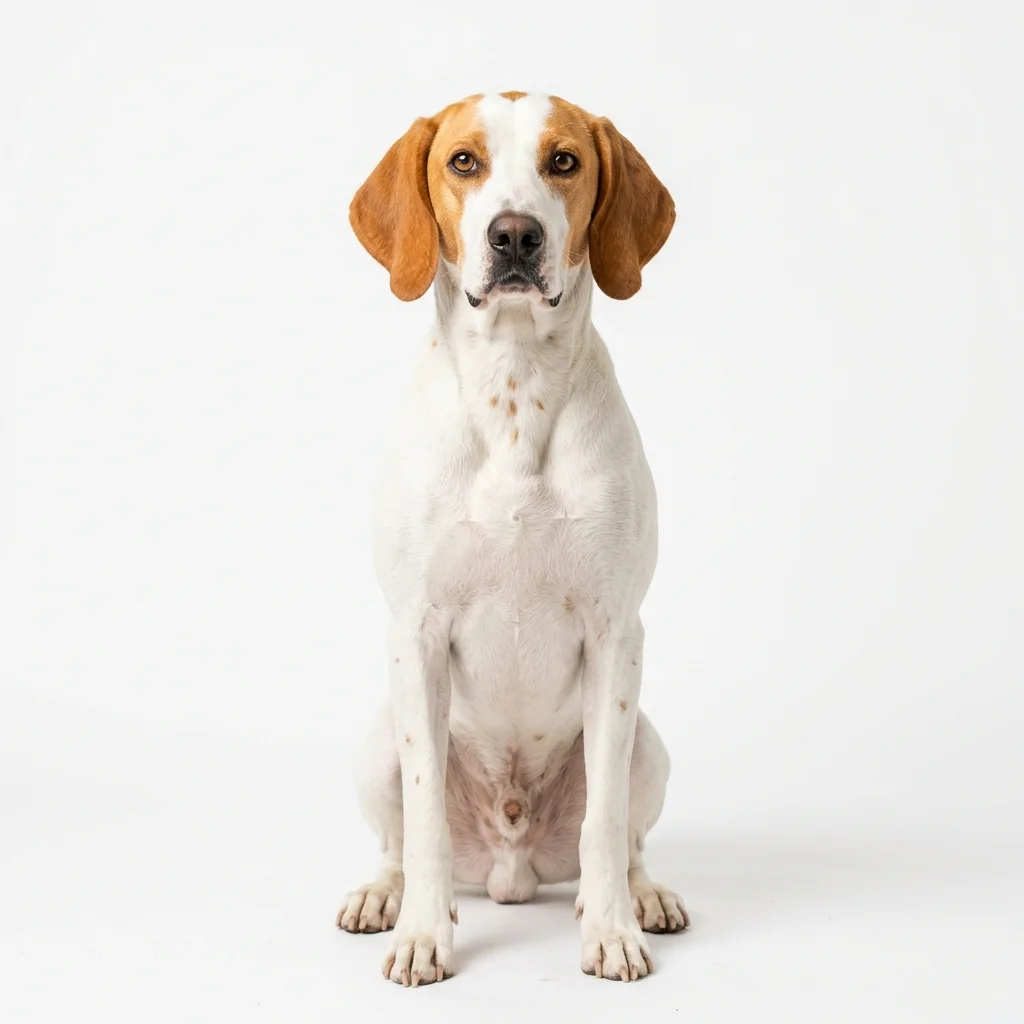 Schlanker kroatischer Laufhund mit kurzem, weißem Haarkleid und orangefarbenen Abzeichen. Traditionell zur Jagd auf Hasen und Füchse eingesetzt.