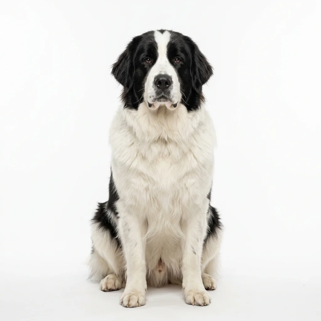 Großer schwarz-weißer Hund vom Typ des Neufundländers. Er ist gutmütig, ruhig und stark wasseraffin.