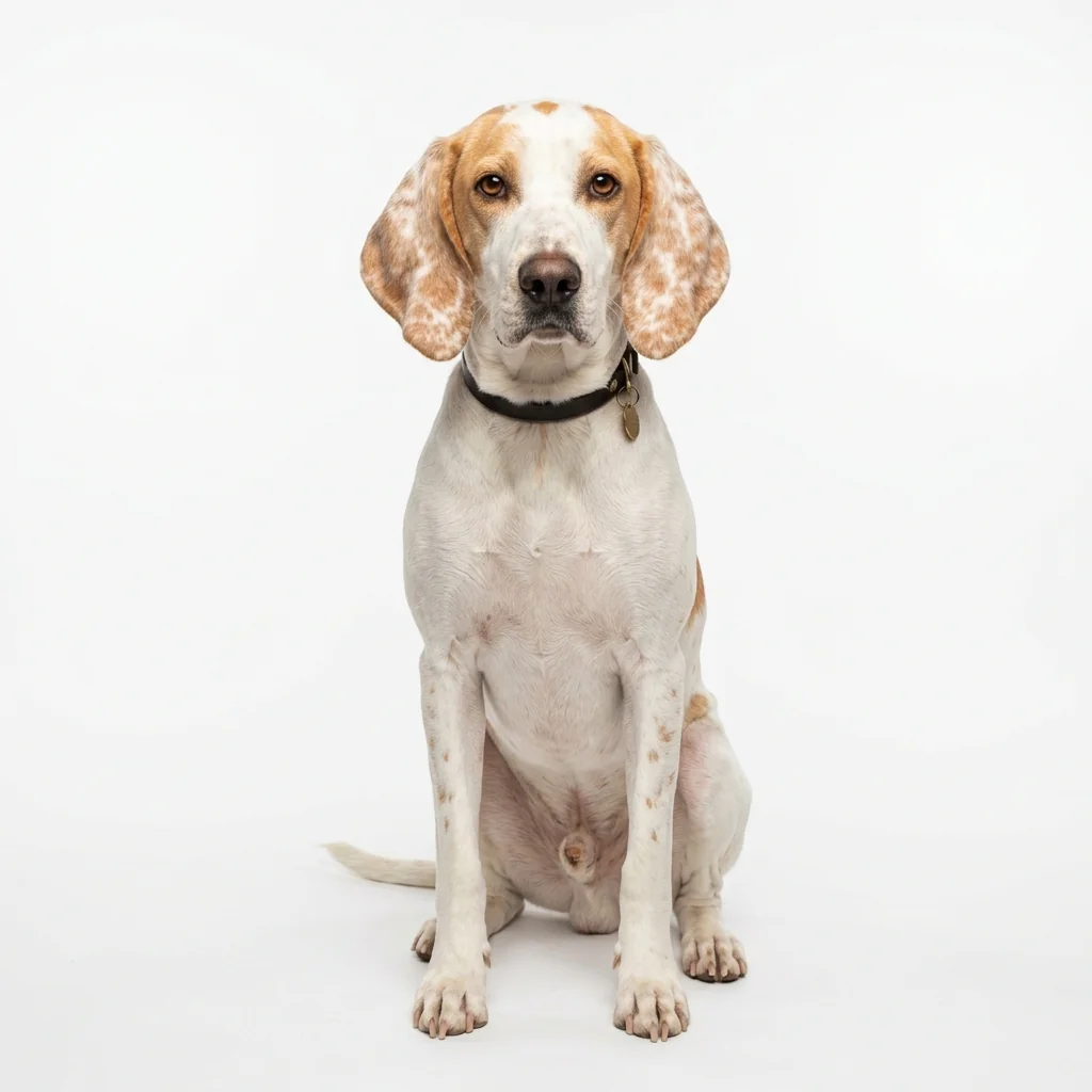 Eleganter französischer Laufhund mit kurzem weißem Haarkleid und orangefarbenen Abzeichen. Wird zur Meutejagd auf Hase und Reh eingesetzt.